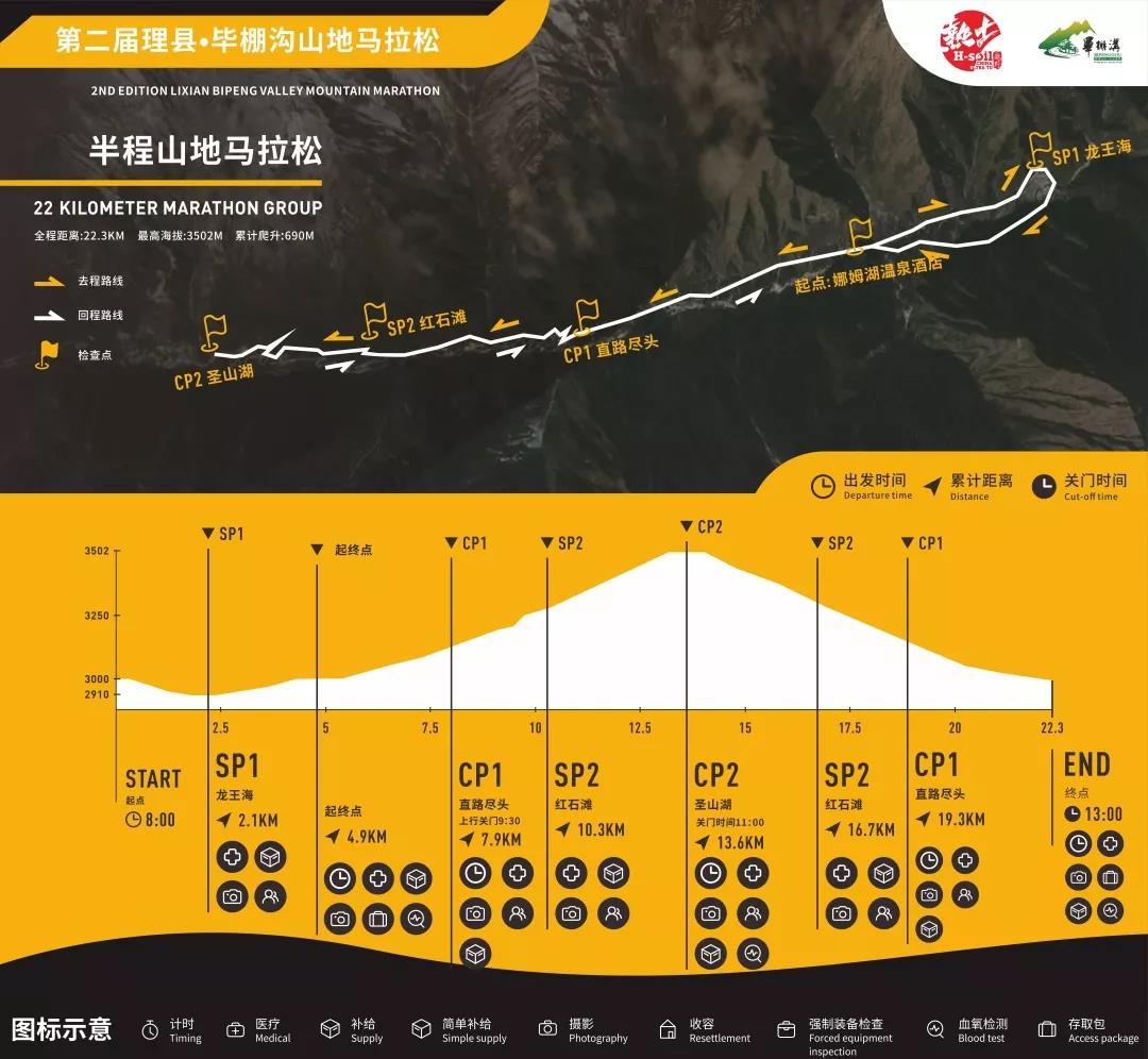 关门时间 注:如遇特殊情况和突发事件时,组委会有权决定提前关门,参赛者须服从指挥。 ▌比赛天气及参赛选手建议装备 9月中旬毕棚沟有下雪可能性,且空气湿度大,体感温度较冷。入秋后气候多变,建议选手准备长袖长裤跑步服装以应对可能出现的低温天气,并准备赛后更换贴身衣物和防寒保暖衣物,如羽绒服、冲锋衣等;若遇雨天,组委会将为选手提供一次性雨衣;毕棚沟高原气候强烈,若晴天,则容易遇到大风、烈日等天气,故建议选手携带太阳镜、太阳帽、防晒霜、皮肤风衣。 ▌衣物存取 所有参赛选手须按照规定到起点存包处存放个人物品,贵重物品请不要存放在包内(如手机、有效证件、现金、信用卡、各种钥匙、掌上电脑等),选手可在回到终点后到存包处领取个人存放物品。若超过最后关门取时间后还没有领取的,可于第二天联系赛事组委会领取,若次日之内还未领取,组委会将按无人领取处理。 ▌计时手环及定位设备 1、计时手环: 计时手环是一种蓝色或黄色的手环,用于比赛计时。在进入CP点时,主动向裁判出示并打卡计时,并配合裁判进行手工计时。手环需小心携带,以防路上遗失。计时手环由组委会提供,赛后需回收。 2、定位设备: 由优徒提供的基于北斗卫星定位系统的实时定位设备,可以实现实时定位、位置分享直播、一键SOS等功能,其外形为蓝色方块,需在开赛前长按开机键(请勿在赛前头一天开机,会导致电量不足),待机身震动并闪烁蓝光后确认开机成功,需将定位设备装在组委会提供的塑封袋内保持干燥,全程不需要其他操作。若需要紧急发送sos求救信号,请按设备的sos求救键 ▌医疗救护 1、在起点、赛道沿途及终点设置固定医疗点,免费为选手提供医疗服务; 2、在赛道沿途各工作站及关键路段安排救援工作人员和车辆,并提供AED; 3、针对高海拔比赛特定赛道中途设置若干血氧检查点,将根据选手情况测量血氧浓度,血氧浓度低于80%的选手将被强制退赛; 4、在比赛过程中,如果被医务人员判定为不能继续比赛的选手,应严格遵守医生建议并配合裁判完成退赛手续。 ▌补给医疗点分布 ▌录取名次与奖励(以枪声成绩为准) 1、各组别男女前三获得名次奖金(迷你马不计时除外); 注:以上奖金为税前金额,将于赛后两日成绩公示期后统一发放 2、所有组别最后一名完赛选手将获得组委会鼓励奖(迷你马不计时除外); 3、所有组别完赛选手均可获得完赛奖牌、电子版完赛证书; 4、所有选手均可参与技术分享会的抽奖环节 ▌违规处罚 组委会将在起点、终点及各工作站安排裁判员,违反以下比赛规定的选手将被取消成绩,其个人资料录入报名系统,两年内禁止参加本赛事。情节严重者,终身禁赛。 1、提供虚假信息报名或报名后由他人替跑; 2、参赛者携带他人计时芯片或一名选手同时携带两枚及两枚以上计时芯片参加比赛; 3、不按规定起跑的; 4、截止关门时间后不停止比赛和退出比赛后又返回赛道的(经过裁判允许的除外); 5、没有沿规定线路跑完所报项目的全程,抄近道或乘坐交通工具或中途进入赛道的; 6、不按规定要求通过终点并领取完赛物品的; 7、没有按规定佩戴号码布通过终点的; 8、私自伪造号码布,使用其他赛事号码布通过终点领取完赛物品、完赛奖牌的; 9、私自涂改、遮挡号码布参赛或转让号码布的; 10、携带非组委会发放芯片通过终点的; 11、以接力方式完成比赛的; 12、不服从赛事工作人员的指挥,干扰比赛,寻衅滋事的; 13、出现任何不文明行为(如随地便溺、乱扔垃圾等); 14、不按规定携带比赛物品的; 15、其他违反比赛规定的行为。 注:利用虚假信息获取参赛资格或者报名后私自转让号码布给他人者,比赛中发生的一切后果责任自负。 ▌调整或取消赛事 如果发生不利于赛事进行的天气情况,包括但不限于火灾、雷暴、地震、暴雨、泥石流、滑坡组委会保留取消或临时调整赛事安排的权利;因天灾、战争、游行示威、爆发疾病以及恐怖主义行为等导致赛事取消的不可抗力事件,赛事将不会退还报名费。 ▌抗议与申诉 凡是对竞赛成绩、裁判员执裁、运动员参赛资格有异议并提出申诉者,需向组委会仲裁委员会提交书面申诉报告及支付¥500.00人民币申诉费,仲裁委员会方可受理申诉并在15个工作日内反馈申诉结果;申诉成功,退还申诉费;申诉失败,申诉费不退还。 ▌保险 组委会已购买公众责任险(不包含参赛者的个人意外保险);本次比赛组委会将赠送所有参赛者人身意外险(20万额度);参赛者如有其他保险需求,可自己购买其他险种保险。 六、赛事安排 | Race Schedule (一)赛前日:2019年9月21日周六 1、重要地点 (1)去程大巴上车地点:地铁2号线羊犀立交C口前行100m中石油加油站 (2)领取参赛包、技术分享会地点:理县毕棚沟宾馆(可百度地图搜索) 2、选手行程 7:00-7:30 选手大巴签到、上车 7:30-12:30 选手大巴行车时间 14:00-21:00 选手领取参赛包(理县毕棚沟宾馆) 19:30-21:00 技术分享会、选手见面会、抽奖(理县毕棚沟宾馆) (二)比赛日:2019年9月22日周日 1、重要地点 (1)赛事摆渡车上车地点:毕棚沟景区北门(官方酒店理县毕棚沟宾馆出门左手20米,可百度地图搜索) (2)起终点:阿坝州理县毕棚沟景区娜姆湖温泉酒店 (3)回程大巴上车地点:官方酒店理县毕棚沟宾馆 2、选手行程 6:00 所有选手到毕棚沟景区北门入口统一乘坐赛事摆渡车至起点(自驾车辆