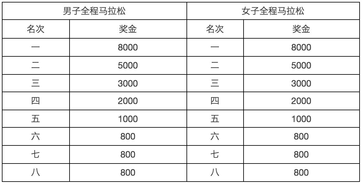 全程马拉松录取男、女个人前8名进行奖励,其中前三名按照枪声计时成绩排名,第4-8名按照净计时成绩排名,分别获得奖金如下(单位:元,人民币):