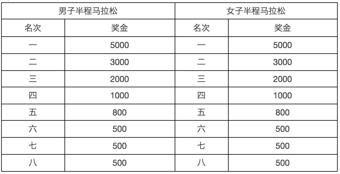 半程马拉松录取男、女前8名进行奖励,按照净计时成绩排名,分别获得奖金如下(单位:元,人民币):