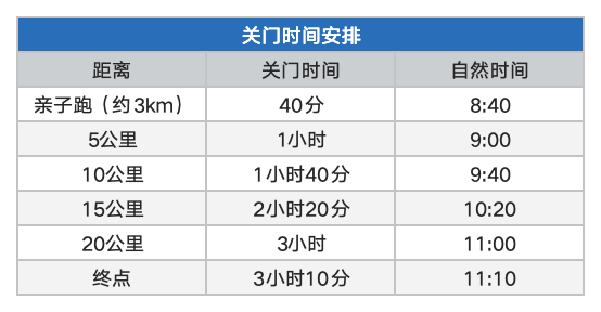 为保证参赛选手安全、顺利,确保城市道路交通秩序,比赛线路各段专设了赛事关门时间,关门时间后,相应公里点的计时毯停止工作,相应路段恢复社会交通。在规定关门时间内,未跑完对应距离的参赛选手须立即停止比赛,退出赛道,以免发生危险。退出比赛的选手可搭乘组委会提供的收容车或自行选乘公共交通抵达相应项目的存取衣物处。如未立即停止比赛,由此引发的事故将由该名选手自行承担相应法律责任和赔偿责任。