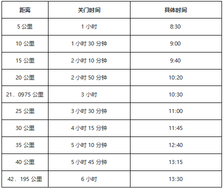 (五)关门时间和时间限制:为了保证跑者比赛安全、顺利,比赛期间比赛路线各段设关门时间,限时进行交通封闭。关门时间到后,相应路段恢复正常交通。在规定的关门时间内,未跑完对应距离的跑者应立即停止比赛,退出赛道,以免发生危险。退出的跑者可乘坐组委会提供的收容车到相应项目的终点处。