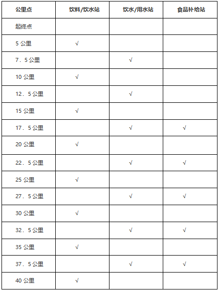 (一)在比赛起点和赛道沿途(自5公里起每2.5公里)及终点均设固定医疗点。赛道沿途配备流动AED医疗救援服务工作人员,赛道沿途配备医疗服务志愿者,协助医疗救护、维护比赛秩序,跑者可随时向他们请求帮助。