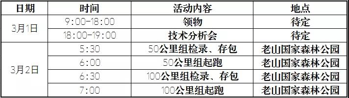 2、赛事采用分枪发令起跑,50公里组起跑时间为6点,100公里组起跑时间为7点,设置总关门时间,并设置分段关门时间,超过关门时间的选手,必须及时退出比赛;