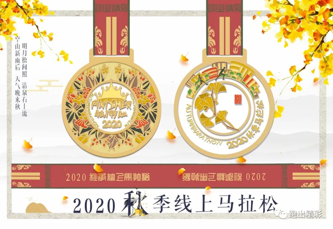 赛事名称:2020秋季线上马拉松 比赛类型:不限场地,线上赛 报名时间:即日起——10月30日 比赛时间:即日起——10月30日 参赛组别:5KM/10KM/半马/全马 成绩上传通道:微信公众号【跑出精彩】 完赛奖牌: 奖牌设计理念: 秋天意味着成熟,是丰收的景象,是一幅多彩的图画,远处,层林尽染,叠翠流金;近处,落叶飘飘成了一道亮丽的风景线。银杏叶黄得有些娇嫩,有些含蓄,城市被点缀成一道道金灿灿的油画路。满地金黄的稻穗,琳琅满目,那是丰收的喜悦,老百姓脸上洋溢着幸福的笑容,秋天是让人感到幸福快乐的季节。  完赛奖牌+电子成绩证书  39元(含运费) Ps:新疆、西藏等偏远地区及港澳台地区需补一定的邮费差价达3人以上团报有优惠,具体可咨询客服小彩微信:pcjc002。 活动规则 1、即日起——2020年10月30日期间,不限跑步地点(公园、操场、街道、跑步机等均可)、不限完成时间,参赛者使用任意手表或跑步软件(APP)单次完成相应组别:5KM/10KM/21.0975KM/42.195KM任一项即可。 2、报名成功完赛后,通过微信公众号【跑出精彩】联系客服,将跑步轨迹发送至客服,客服将在7个工作日后统一发放完赛电子成绩证书,完赛奖牌将在活动结束后20个工作日统一快递寄出。 1、报名并购买奖牌成功后,参赛者在活动时间内上传跑步成绩,赛后可收到活动奖牌和电子成绩证书,若未在时间内上传成绩,则只能获得电子成绩证书。 2、因参赛者地点不同,完赛奖牌收到的时间也会不一,若因收件地址有误或不详导致收货失败,如需重新寄送,需自付邮费;如有疑问请联系客服小彩微信:pcjc002。 3、因纪念奖牌为专属定制类产品,一经报名成功,恕不接受退款申请,不支持退换/退款,请理性报名参与。 注意事项 马拉松赛是一项大强度长距离的运动,对参者身体状况有较高的要求,参赛者应身体健康,有经常参加跑步锻炼的基础,参赛者可根据自己的身体状况和能力参加比赛。 有以下疾病患者不宜参加比赛: 1、先天性心脏病和风湿性心脏病患者; 2、高血压和脑血管疾病患者; 3、心肌炎和其他心脏病患者; 4、冠状动脉病患者和严重心律不齐者; 5、血糖过高或过低的糖尿病患者; 6、比赛日前两周以内患感冒; 7、其它不适合运动的疾病患者; 8、孕妇。 因此,请各位参赛者在参与活动过程中特别注意以下事项: 1、赛前做好充分的热身准备,以避免剧烈运动对身体造成意外伤害; 2、跑步过程中,如发现身体有肌肉痛、关节痛以及极强的疲劳感等不适,请参赛者量力而行,必要时放弃比赛,以保证人身安全; 3、跑步过程中,如遇炎热、寒冷、大风、降水、雾霾沙尘等极端天气,请参赛者自行调整比赛计划,以保证人身及财产安全; 4、尽量让家人和朋友知晓您参赛日的跑步路线和时间。