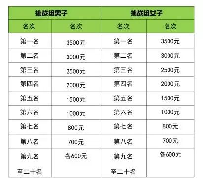 (三)总奖金145000元人民币,分别录取专业组男子、女子前10名,挑战组男子、女子前20名颁发奖金、关门时间内完赛发完赛奖牌;公开组到达终点后颁发完赛奖牌及纪念品。