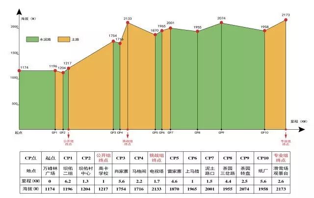 总长40km,累计爬升986m,海拔最高点2173m,最低1172m,平均海拔1742m,路面分为硬化路、砾石路、泥路和古驿道组成,赛道有效平均宽度约2.2m。